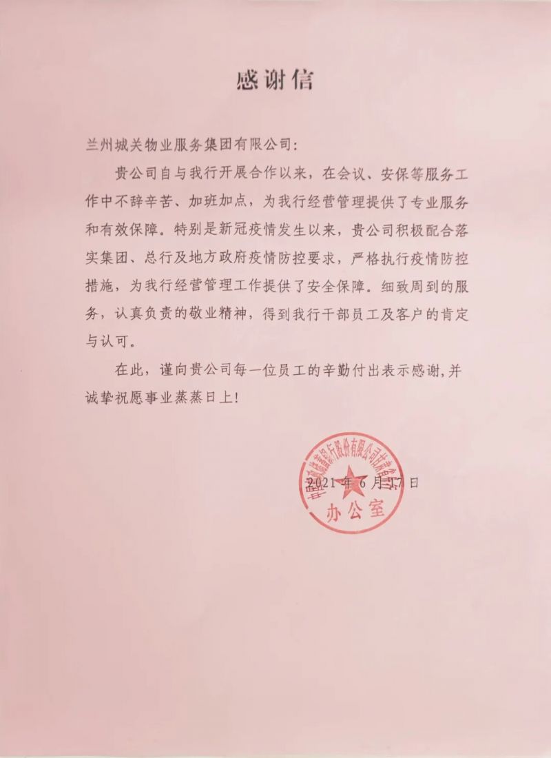 中國郵政儲蓄銀行甘肅省分行是城關(guān)物業(yè)服務(wù)的眾多項目之一,自合作以來(lái),我們在會(huì )議、安保等服務(wù)工作中為甲方提供了專(zhuān)業(yè)服務(wù)和有效保障;尤其在疫情期間,我們嚴格執行疫情防控措施,為銀行的正常運轉提供了安全保障。我們認真負責的工作態(tài)度和不辭辛苦、加班加點(diǎn)的敬業(yè)精神得到了銀行員工及服務(wù)客戶(hù)的肯定與認可。